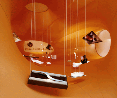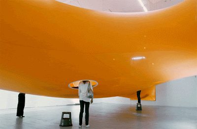 Visitors bend down under the fabric into which openings were cut. Through these holes, visitors pop their heads up into the orange space to view drawings, models and photographs suspended from wires -> found on coolhunter.
